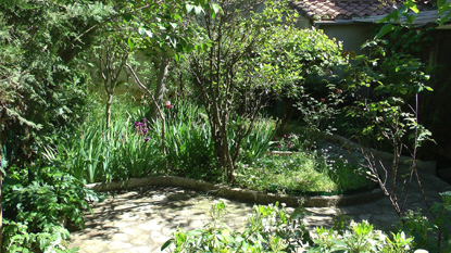 | la terrasse couverte, ombragée (orientée au nord) | le jardin |